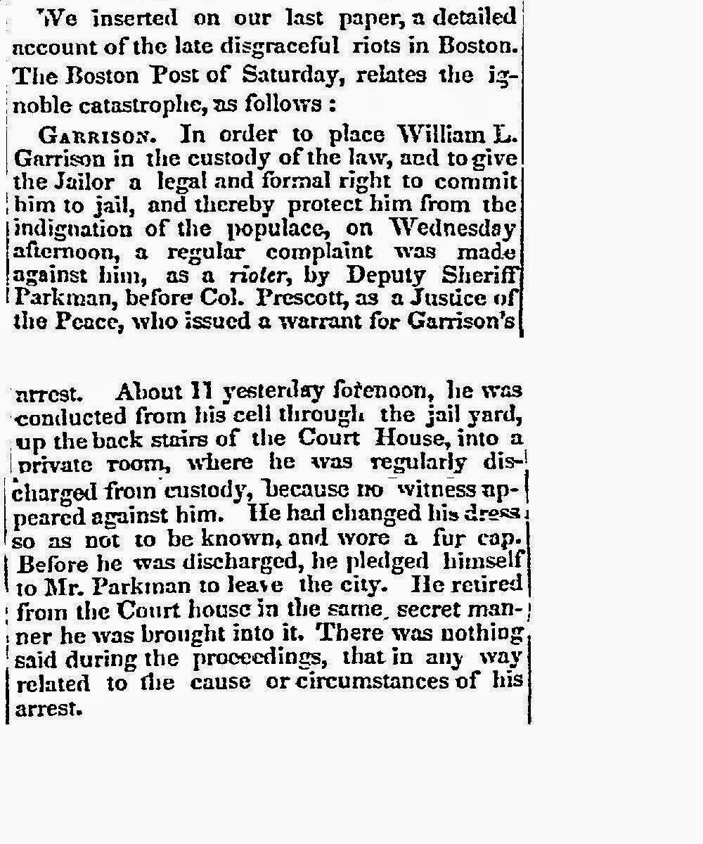 [Boston; Post; Saturday; Garrison; William L. Garrison; Jailor; Wednesday; Deputy; Sheriff; Parkman] Tuesday, October 27, 1835 Salem Gazette (Salem, MA)