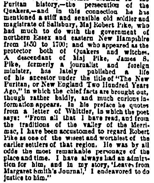 - “Our Boston Literary Letter. Puritans, Witches and Quakers. The Life of Robert Pike – New Hampshire” Springfield Republican Massachusetts Wednesday April 23, 1879